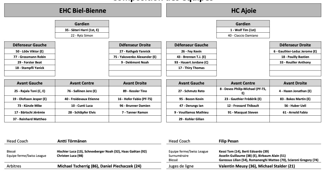Formation des équipes et joueurs indisponibles pour le match Bienne vs Ajoie 26/11/2022 Follow SwissHabs Derniers articles Il y a 6 jours Marie-Philip Poulin signe un record olympique Il y a 6 jours Un match de suspension et une amende contre Rico Gredig Il y a 6 jours Suspension provisionnelle et ouverture d'une procédure contre Justin Studer Il y a 6 jours La fédération française exclut Pierre Crinon de l'équipe Il y a 6 jours Formation des équipes pour le match Suisse vs Canada