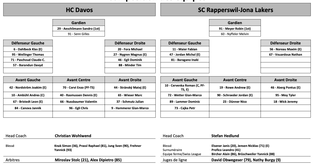 Formation des équipes et joueurs indisponibles pour le match Davos vs Rapperswil 06/01/2023 Follow SwissHabs Derniers articles Il y a 3 heures Régis Fuchs sera honoré cette semaine Il y a 4 heures Prolongations de contrats à l'EHC Coire Il y a 5 heures Diego Kostner absent quelques semaines Il y a 5 heures Pontus Åberg passera les prochains matchs à Kloten Il y a 7 heures Deux autres renforts pour le HC Viège