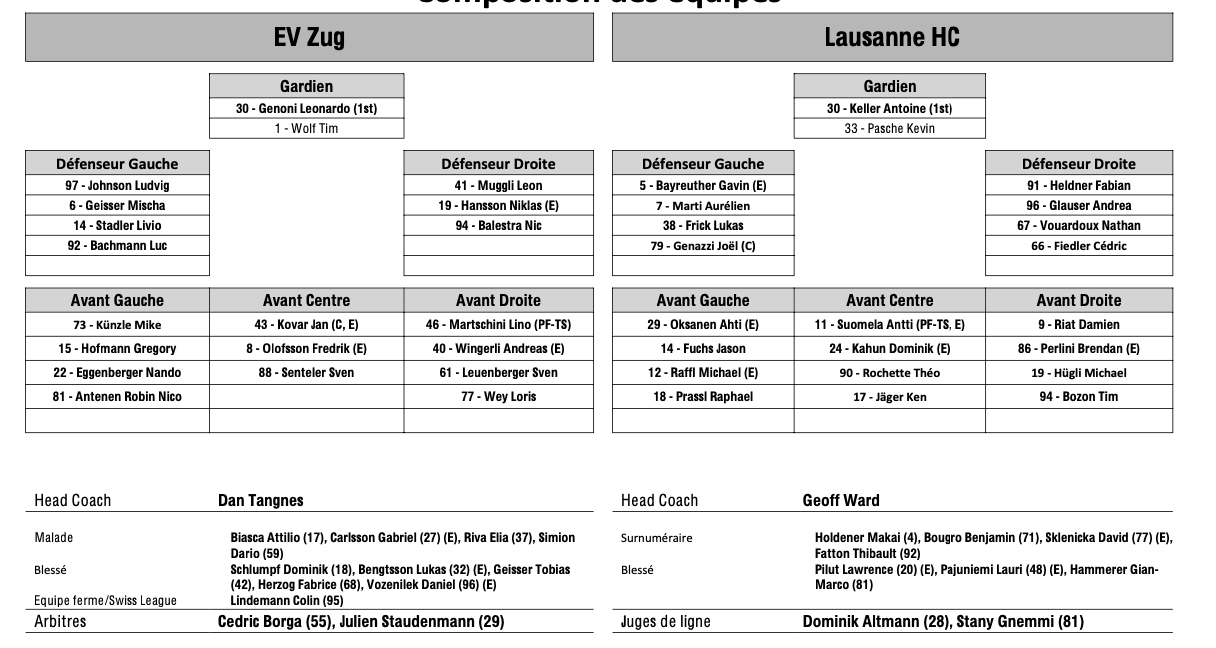 Formation des équipes et joueurs indisponibles pour le match Zoug vs Lausanne 01/03/2025 Follow SwissHabs Derniers articles Il y a 2 heures Régis Fuchs sera honoré cette semaine Il y a 3 heures Prolongations de contrats à l'EHC Coire Il y a 4 heures Diego Kostner absent quelques semaines Il y a 5 heures Pontus Åberg passera les prochains matchs à Kloten Il y a 6 heures Deux autres renforts pour le HC Viège