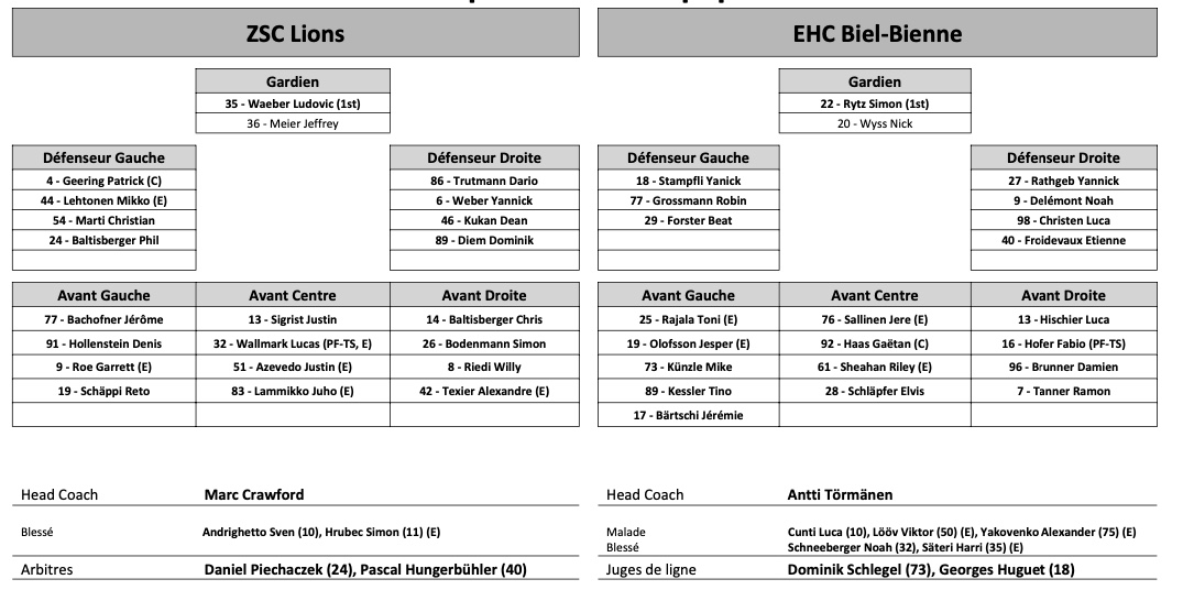 Formation des équipes et joueurs indisponibles pour le match Zurich vs Bienne 01/01/2023 Follow SwissHabs Derniers articles Il y a une heure Régis Fuchs sera honoré cette semaine Il y a 2 heures Prolongations de contrats à l'EHC Coire Il y a 4 heures Diego Kostner absent quelques semaines Il y a 4 heures Pontus Åberg passera les prochains matchs à Kloten Il y a 6 heures Deux autres renforts pour le HC Viège