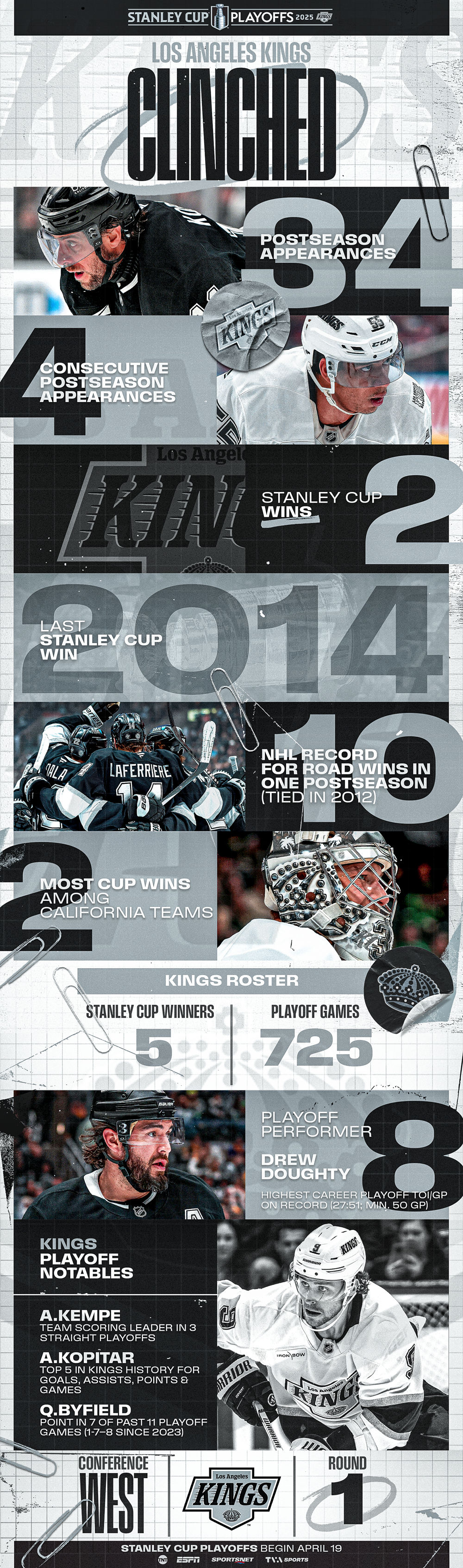 * Les Kings sont à la recherche de leur première victoire en séries éliminatoires depuis qu'ils ont remporté la Coupe Stanley en 2014 et deviendront la première équipe californienne à passer le premier tour depuis les Sharks (2019 CF).